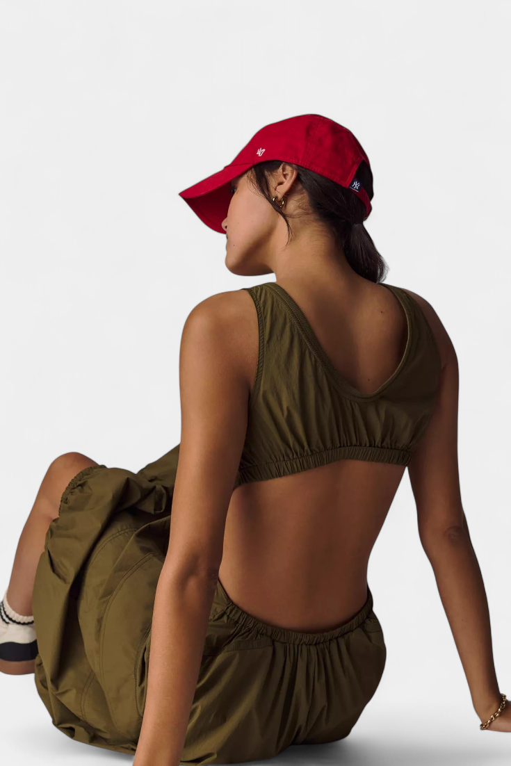 • Details: Boat neckline, open back, slanted + cargo pockets.